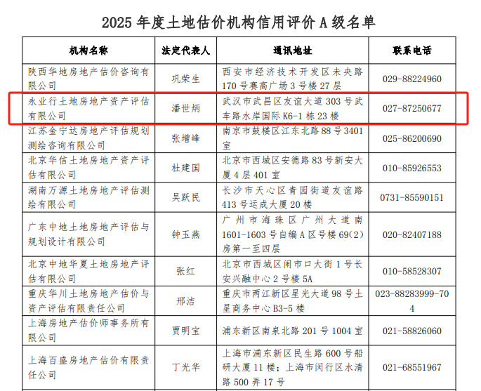 2024年12月25日,中国土地估价师与土地登记代理人协会(下简称“中估协”)发布“2025年度土地估价机构信用评价(A级资信)”结果,此次公布荣获土地估价机构信用评价A级共120家、准A级共60家,永业行位列全国第二、湖北第一,连续17年获评“土地估价机构信用评价A级”。